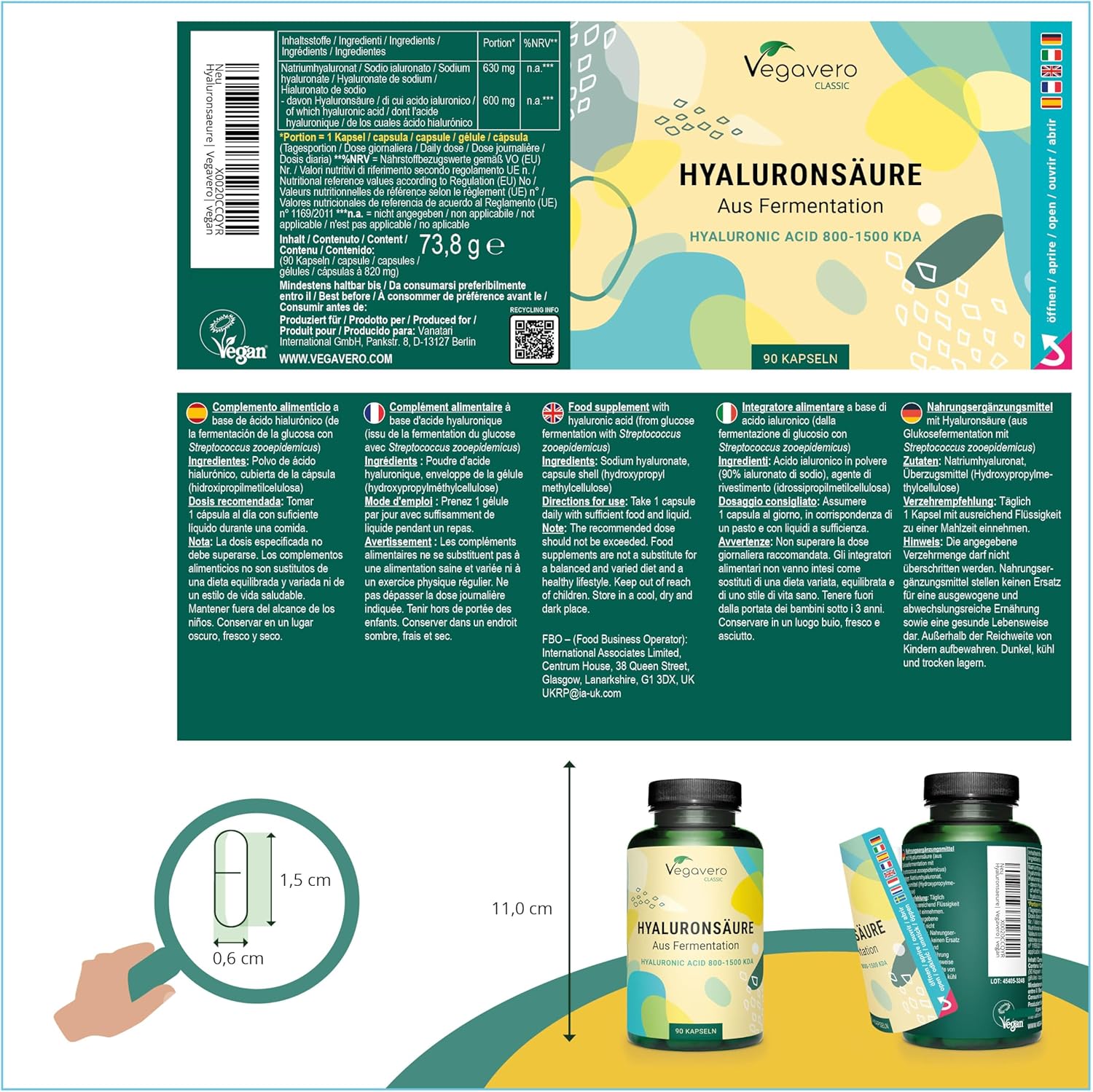 Dès le premier contact avec le produit, j’ai été impressionné par son engagement envers la qualité. Vegavero, fondée à Berlin, se consacre à offrir des compléments alimentaires de haute qualité, et c’est exactement ce que je recherchais. L’Acide Hyaluronique Pur Vegavero® est issu de la fermentation, ce qui le rend non seulement 100% naturel, mais aussi très biodisponible. Une dose de 600 mg par gélule, c’est le plus élevé que j’ai pu trouver sur le marché !