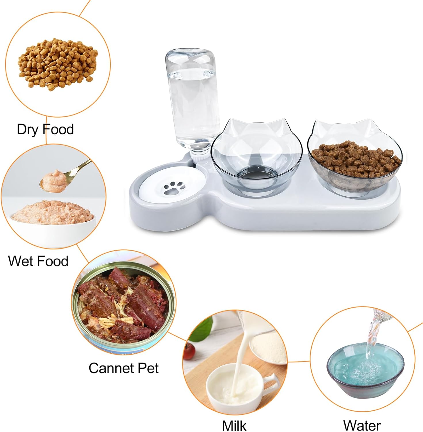 【Conception 3 En 1】 3 En 1 Gamelle Chat Eau, Les Deux Bol Chat Peuvent Contenir Respectivement De La Nourriture Sèche Et De La Nourriture Humide, Et La Fontaine D’Eau De 500 Ml Attachée Peut Garder Votre Chat Hydraté. Les Bols Doubles Peuvent Également Être Tournés Et Ajustés À 360° Pour Offrir Aux Animaux Une Expérience Culinaire Plus Confortable.