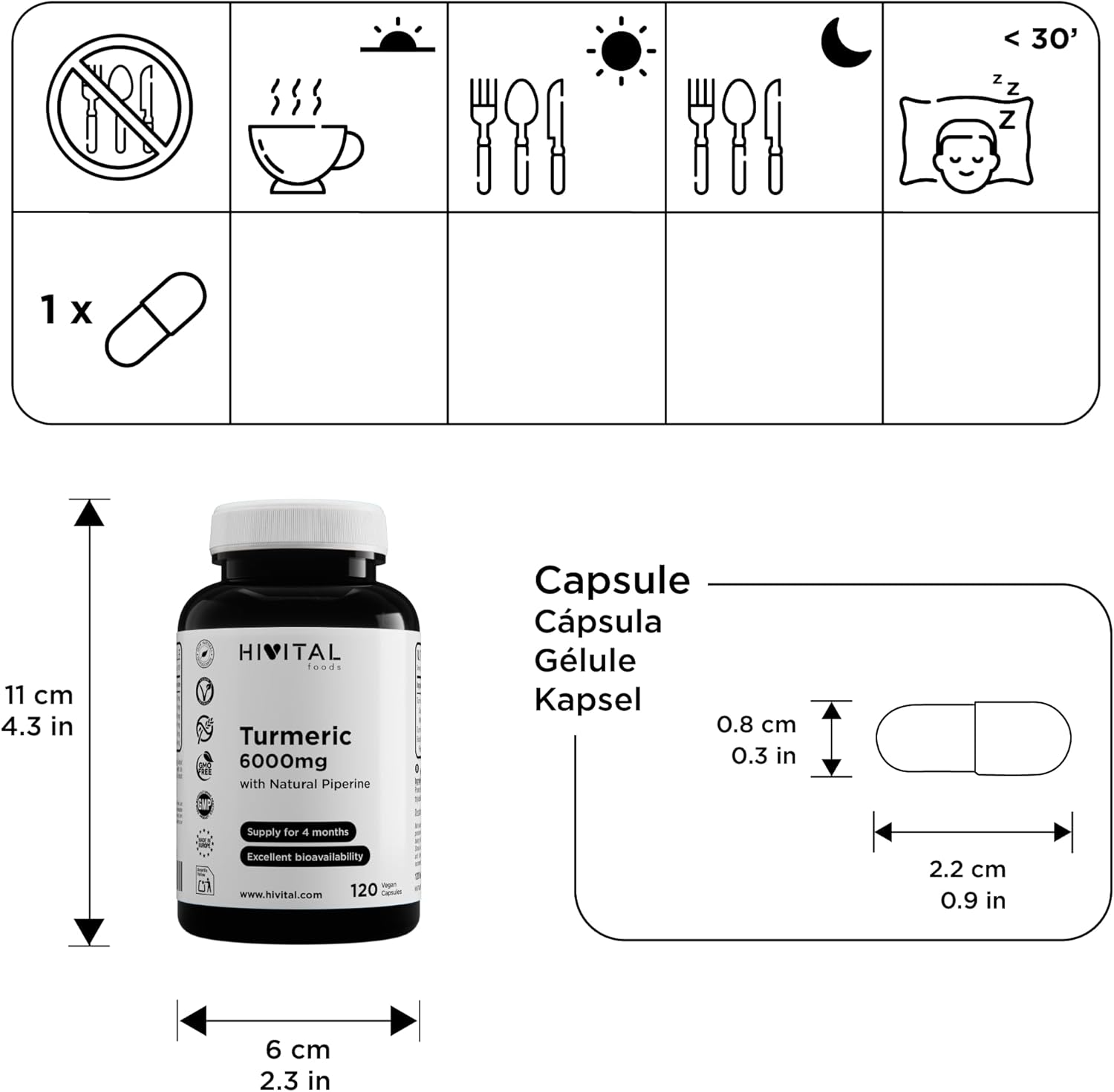 | Hivital Curcuma 6000 mg | 6000 mg | 285 mg | 95 % Pipérine | 120 | 27,99 € |