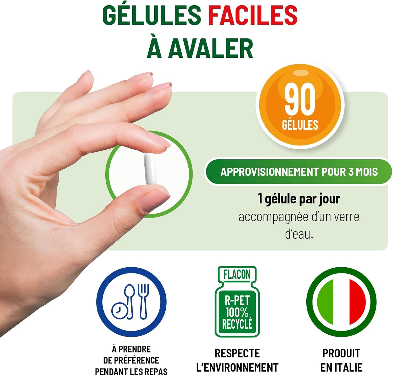 Chaque boîte contient 90 gélules, permettant un traitement de 90 jours. La posologie recommandée est simple : une gélule par jour, de préférence avec de l’eau au cours d’un repas. Cela rend le complément facile à intégrer dans votre routine quotidienne.