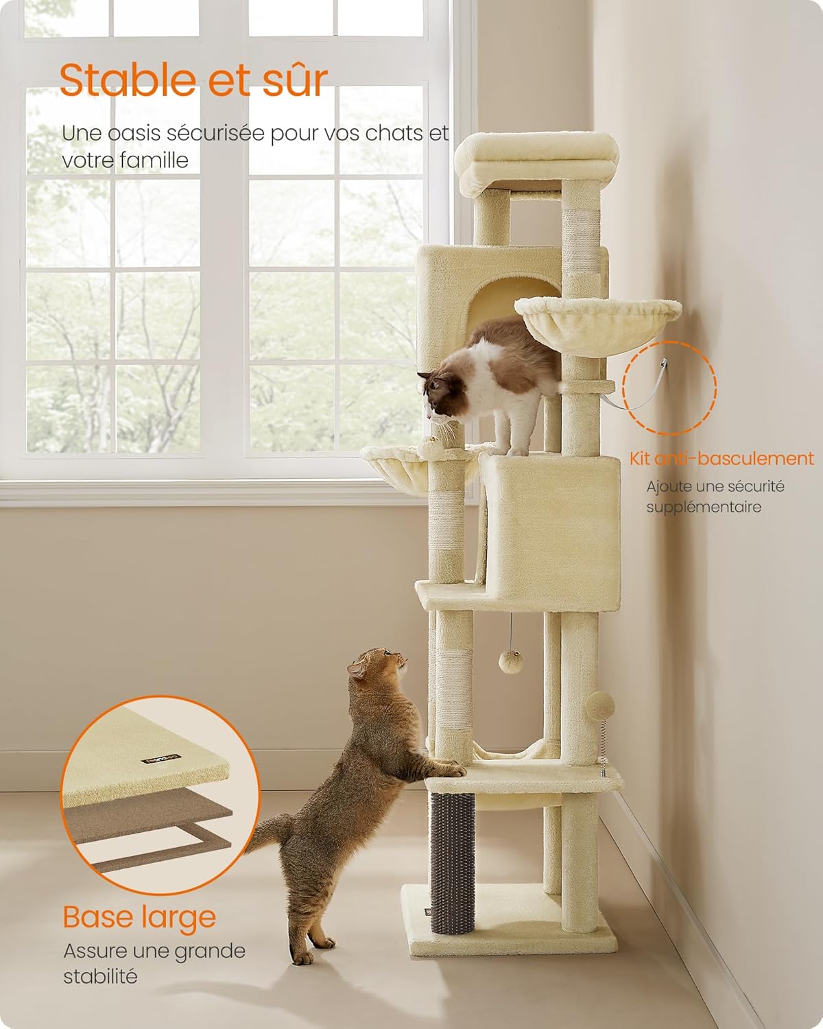 Dès le premier coup d’œil, le Feandrea Arbre à Chat séduit par son design élégant en beige sable qui s’intègre parfaitement dans n’importe quel intérieur. Avec des dimensions de 57 x 45 x 175 cm, il offre largement d’espace pour plusieurs chats, tout en étant suffisamment compact pour ne pas encombrer votre pièce.