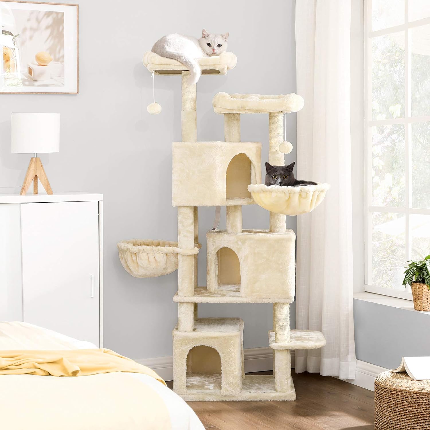 L’une des premières choses qui m’a frappé avec cet arbre à chat, c’est sa taille impressionnante de 164 cm de hauteur. Avec trois niches, deux paniers transats et deux plate-formes d’observation, il offre suffisamment d’espace pour que mes chats puissent se prélasser, grimper et jouer ensemble. C’est un vrai jardin d’escalade qui convient aussi bien aux chatons qu’aux matous plus âgés. Un client m’a même raconté que son vieux chat, qui avait du mal à sauter, a retrouvé sa jeunesse grâce à cet agencement en escalier.