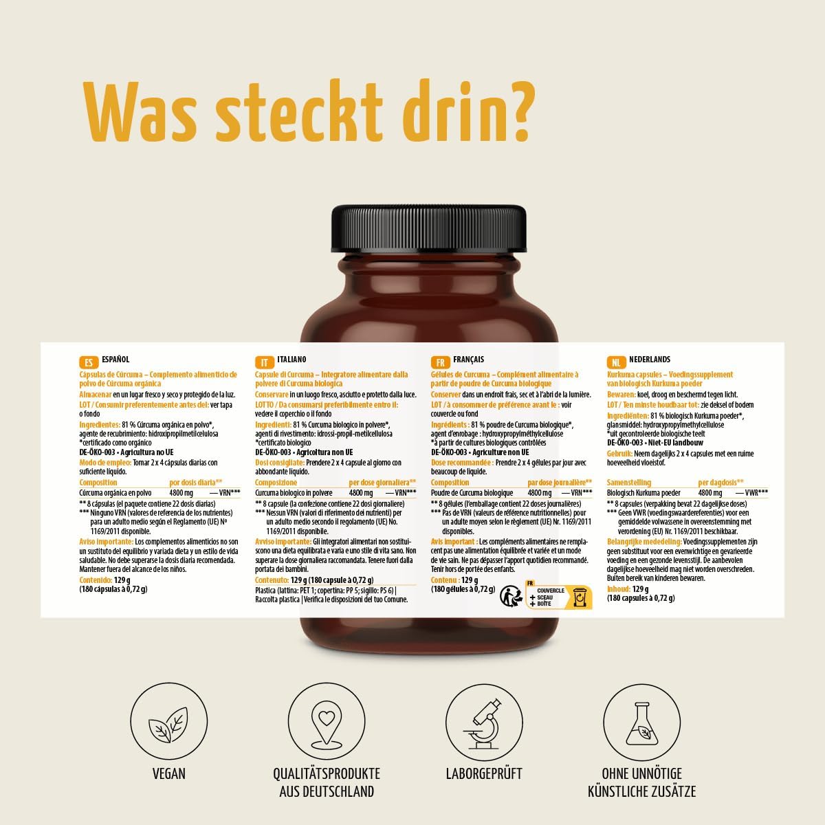 Les gélules de curcuma bio de Achterhof contiennent 4800 mg de poudre de curcuma par dose journalière, ce qui est assez impressionnant. Chaque capsule est fabriquée à partir de curcuma de qualité biologique, fraîchement moulue, ce qui garantit que vous obtenez le meilleur de ce que la nature a à offrir.