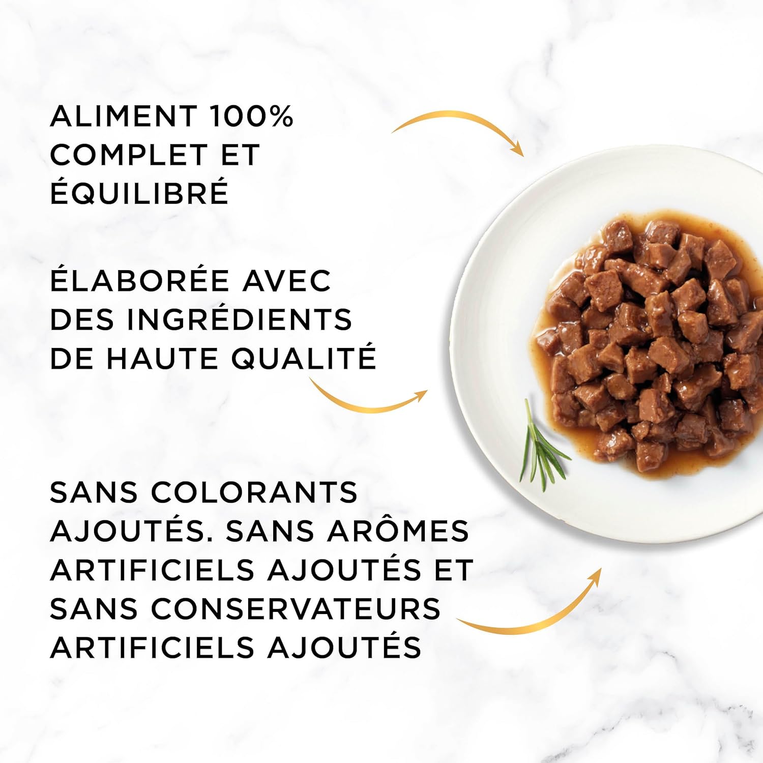 Les ingrédients principaux incluent de la viande (poulet, bœuf, saumon, thon) et une généreuse portion de sauce. Il n’y a pas de colorants ni de conservateurs artificiels.