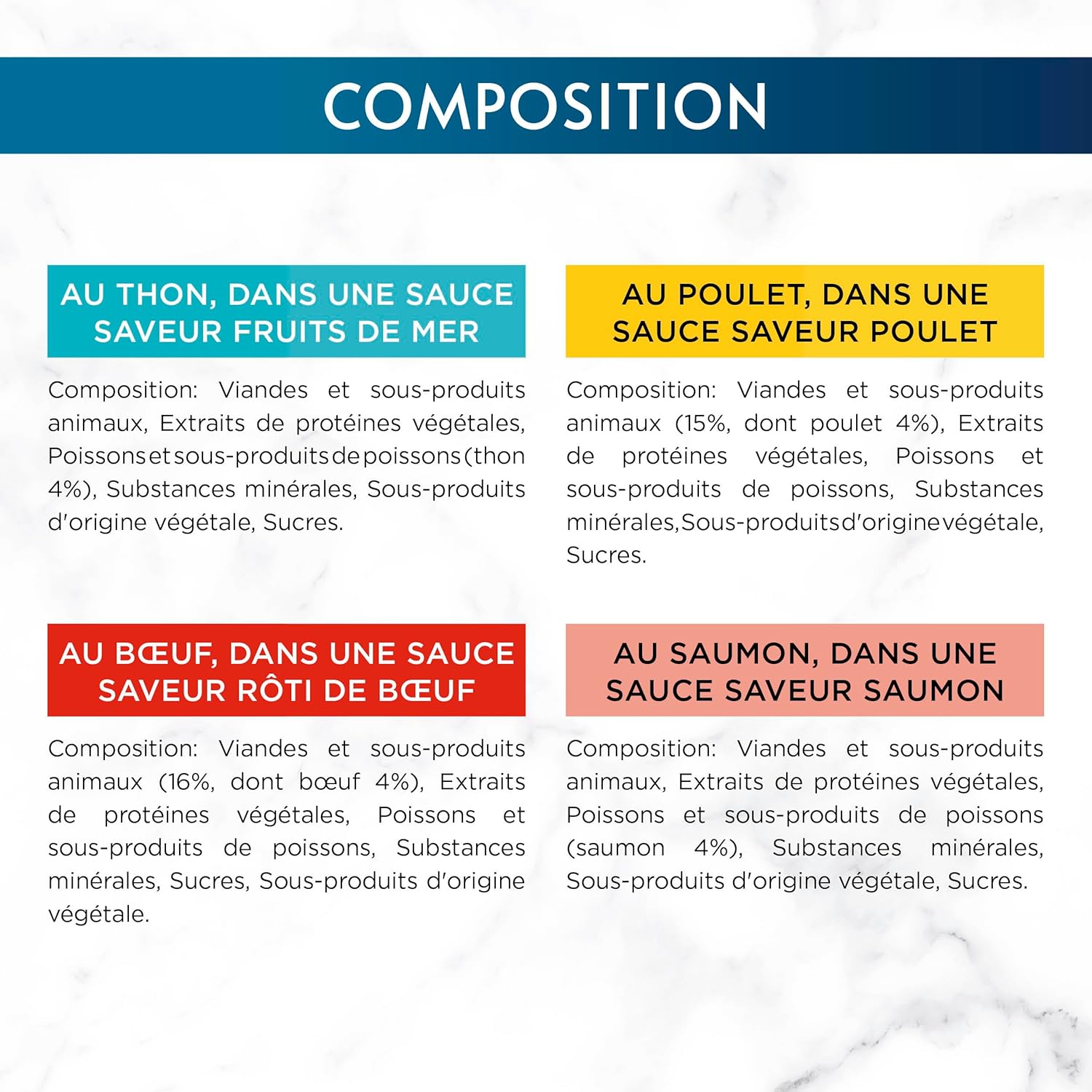 GOURMET a mis au point une recette qui combine une généreuse portion de sauce avec des effilés de poulet, de bœuf ou de poisson. Chaque sachet contient 82% d’humidité, ce qui aide à maintenir mon chat bien hydraté. Avec 11,5% de protéines, cet aliment répond aux besoins nutritionnels essentiels des chats. En plus, il est sans colorants ni conservateurs artificiels, ce qui me rassure sur la qualité de ce que je donne à mon compagnon à quatre pattes.