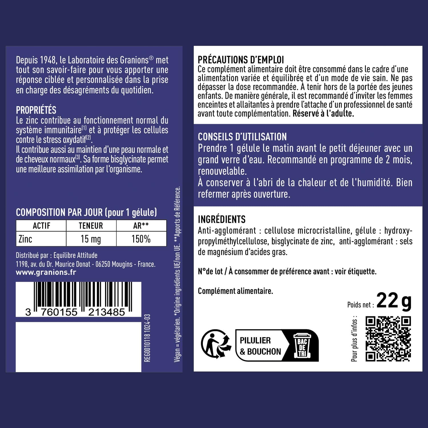 Oui, le Zinc Bisglycinate de Granions est formulé sans ingrédients d’origine animale et convient donc aux végétariens.