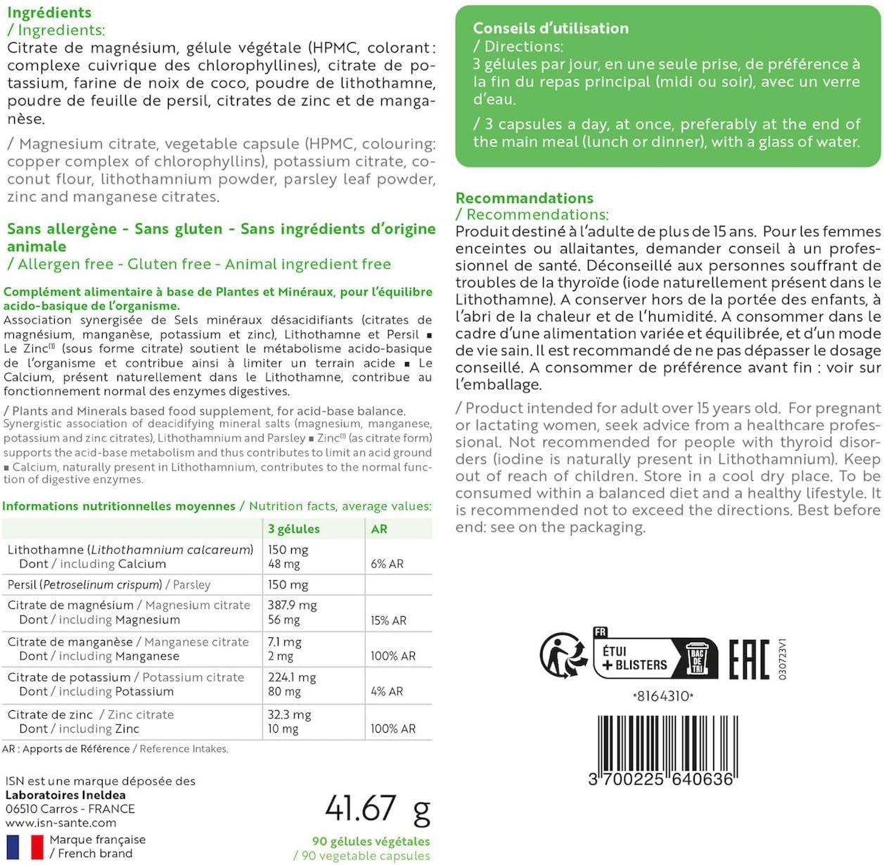 Le complément ISN – Ineldea Santé Naturelle Acido-Base est formulé avec des ingrédients soigneusement sélectionnés, notamment du zinc, du potassium, du magnésium, du manganèse, du lithothamne et du persil. Ces éléments, connus pour leurs propriétés bénéfiques, visent à neutraliser l’excès d’acidité dans l’organisme et à restaurer un pH équilibré. En d’autres termes, ce complément pourrait bien être le petit coup de pouce dont vous avez besoin pour vous sentir mieux dans votre corps.