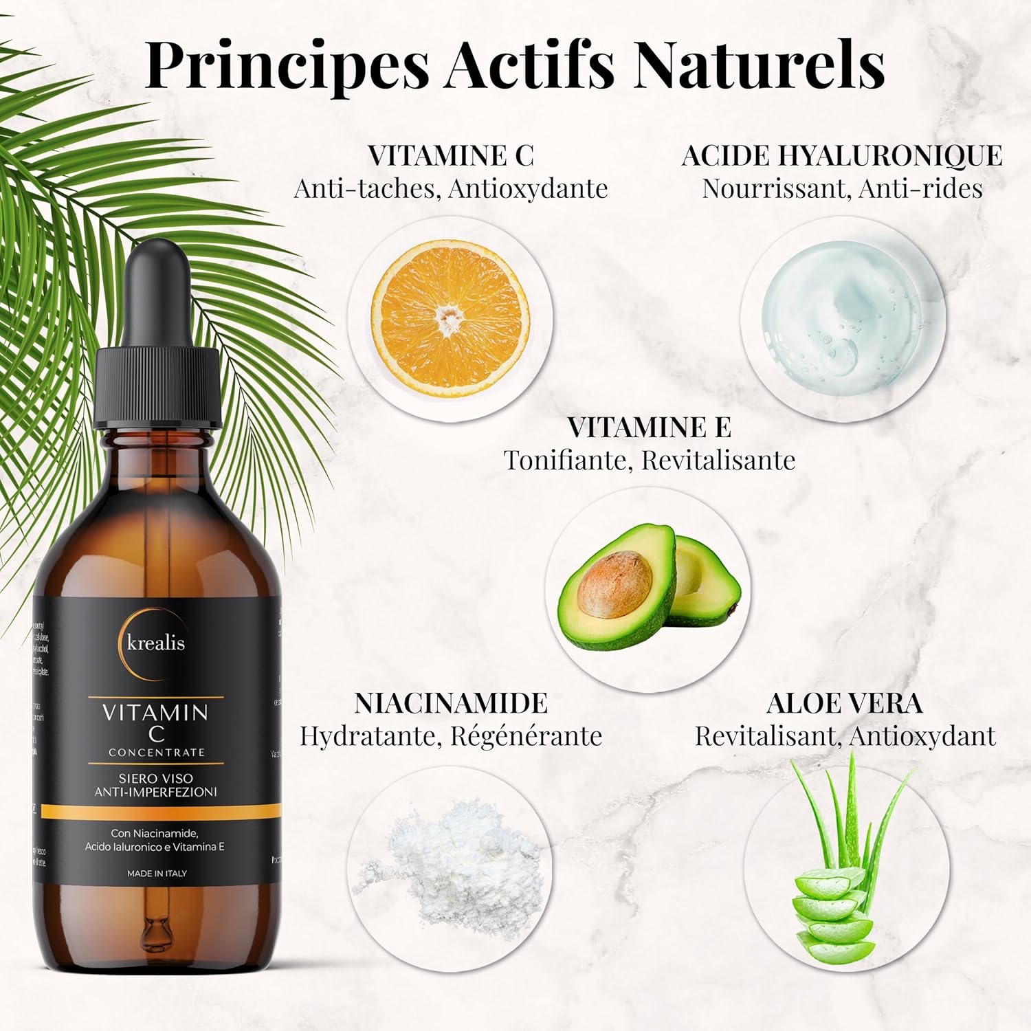 | Krealis Sérum Visage Vitamine C | Vitamine C, Acide Hyaluronique, Niacinamide | Éclaircissant, Hydratant, Anti-imperfections | 11,99 € |