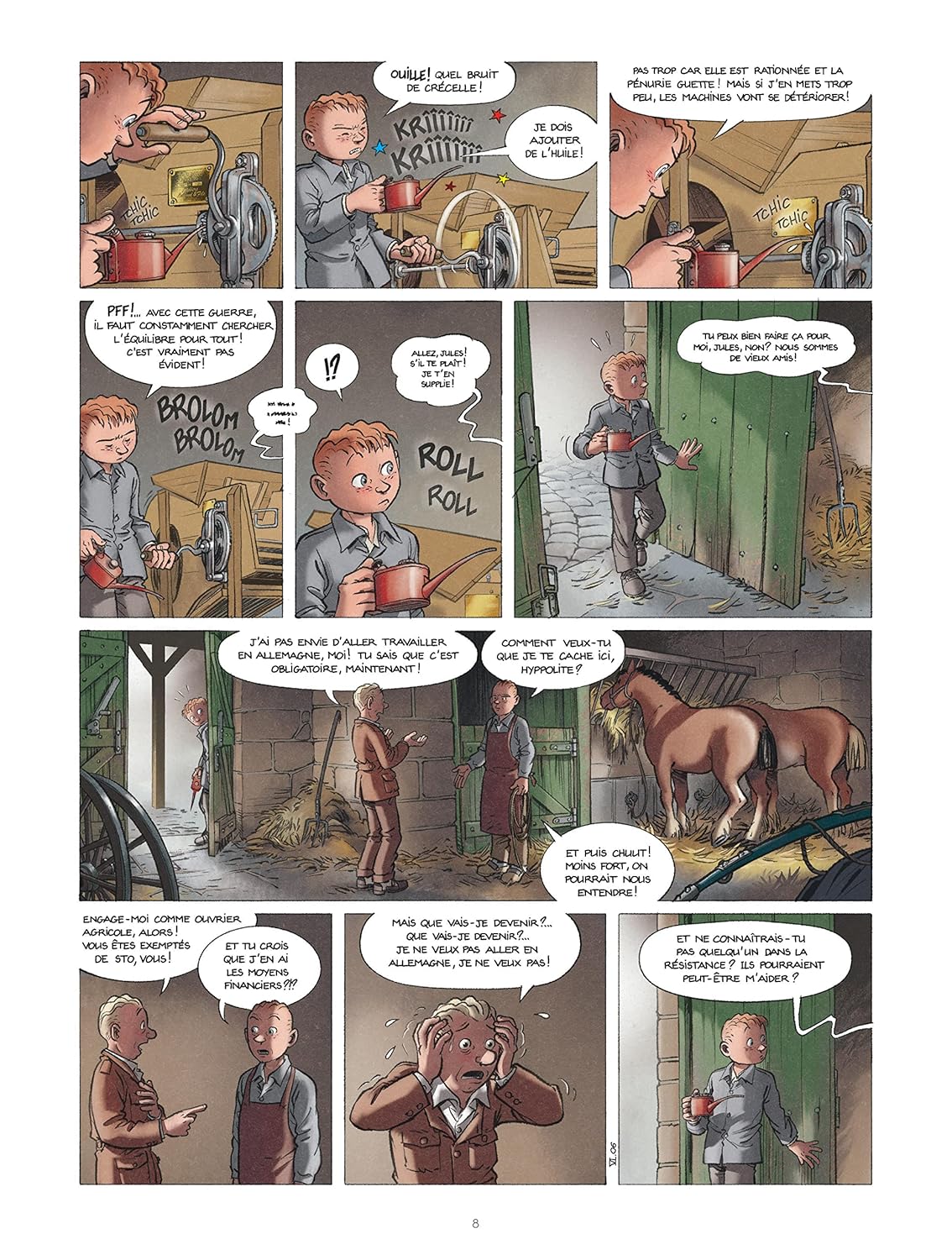L’intrigue de ce tome tourne autour de la décision de l’Allemagne de faire venir de force des travailleurs français par le biais du Service du Travail Obligatoire (STO). Les personnages principaux sont en proie à un dilemme moral : comment résister à un ennemi si puissant tout en protégeant ceux qu’ils aiment ? J’ai trouvé que l’auteur, Vincent Dugomier, a su traiter ce sujet sensible avec beaucoup de nuance.