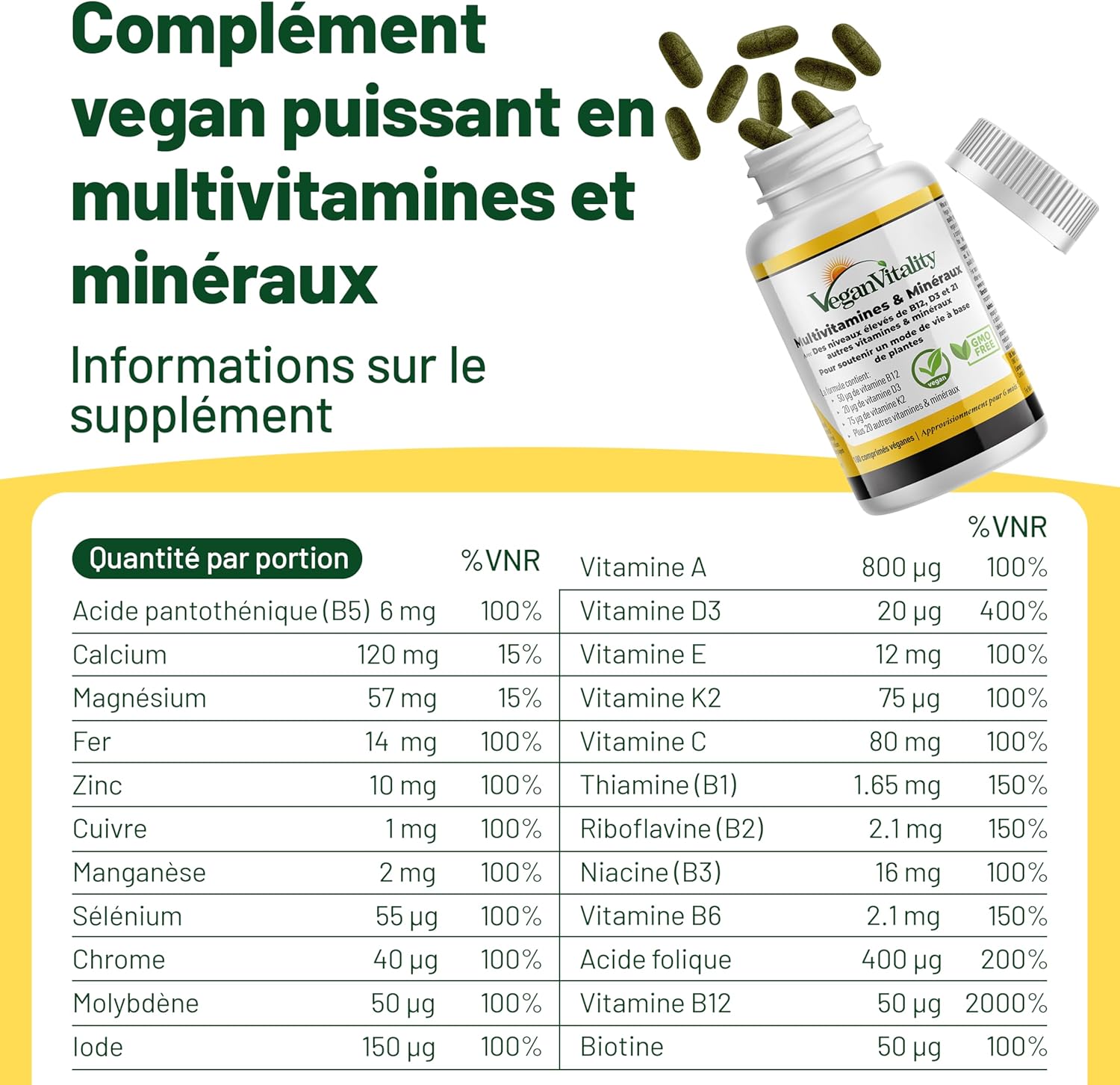 Les Multivitamines Vegan Vitality se distinguent par leur formule enrichie, apportant à la fois des vitamines et des minéraux essentiels. Avec des ingrédients comme la vitamine C, la vitamine K2, la vitamine B12 et le fer, ce complément offre un ensemble équilibré de nutriments qui peuvent revigorer votre énergie et soutenir votre système immunitaire. Pour moi, avoir un apport suffisant en ces vitamines est crucial, surtout pendant les périodes de stress ou de fatigue.