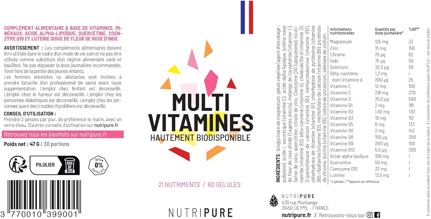 Nutripure est une marque française qui se spécialise dans les compléments alimentaires naturels, purs et efficaces depuis 2018. Leur produit phare, le Multivitamines et Minéraux 21 Nutriments, se positionne comme un allié pour la santé, surtout dans un monde où notre alimentation moderne peut parfois manquer de nutriments essentiels.