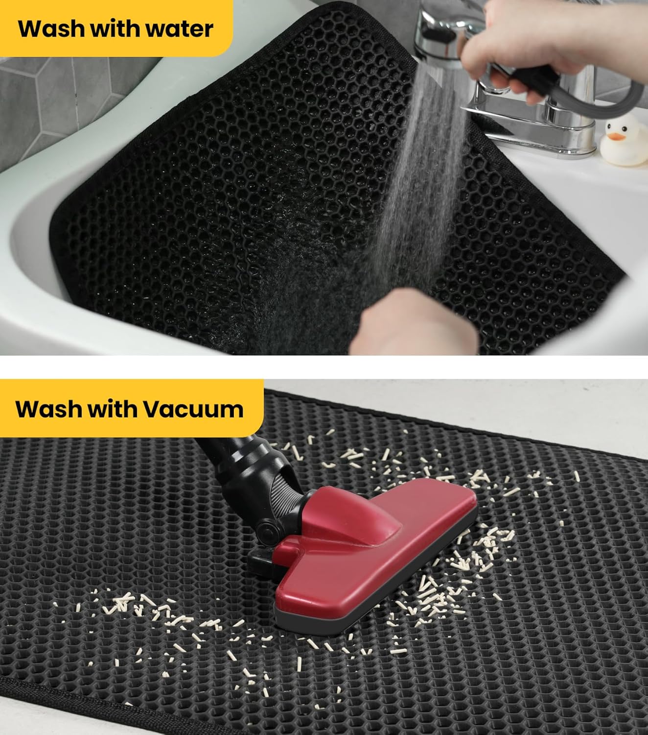 Ce tapis est conçu pour simplifier la vie des propriétaires de chats. Il suffit de pencher légèrement le tapis pour faire glisser la litière directement dans la poubelle. Spoiler alert : c’est vraiment aussi facile que ça ! J’ai même essayé de passer l’aspirateur dessus, et cela a très bien fonctionné. Pour les taches tenaces, un peu de savon et un rapide rinçage suffisent. Un client m’a même raconté que ce tapis lui avait fait gagner un temps précieux qu’il pouvait maintenant passer à jouer avec son chat.