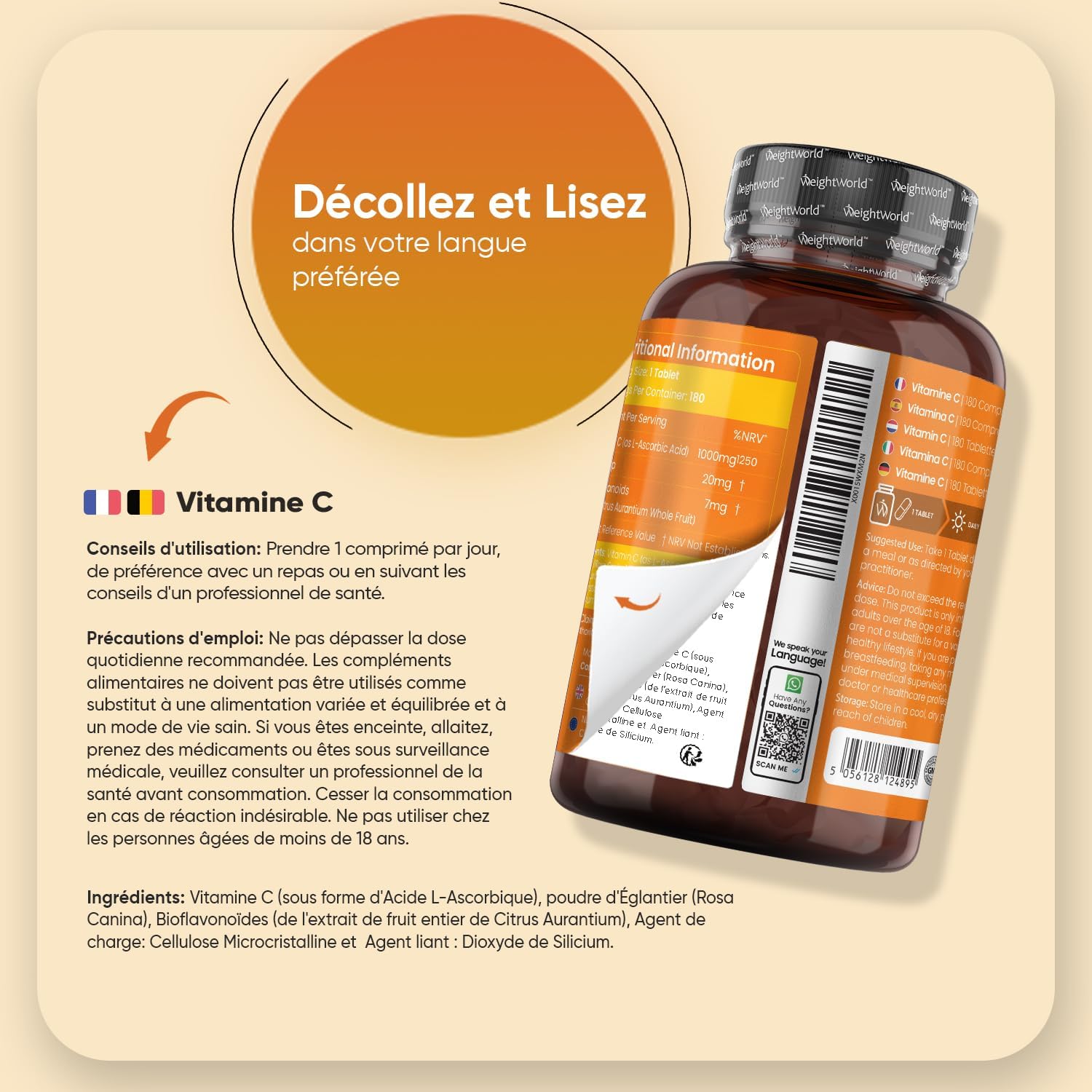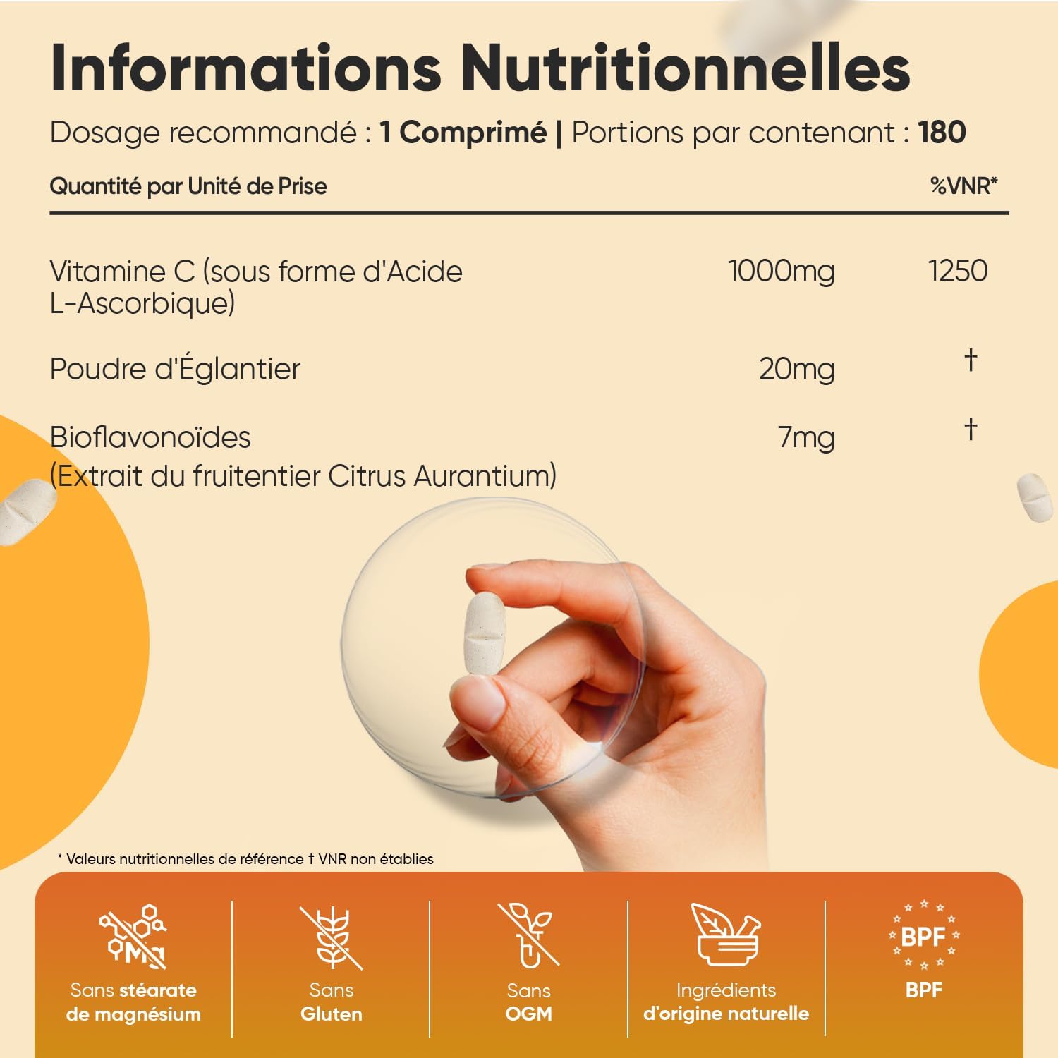 Chaque comprimé de ce complément alimentaire contient 1000mg de vitamine C, ce qui est idéal pour répondre aux besoins quotidiens des adultes. Avec 180 comprimés par pack, vous avez un approvisionnement pour six mois, ce qui est un bon rapport qualité-prix. Spoiler alert : vous n’aurez pas à vous soucier de renouveler votre stock chaque mois !