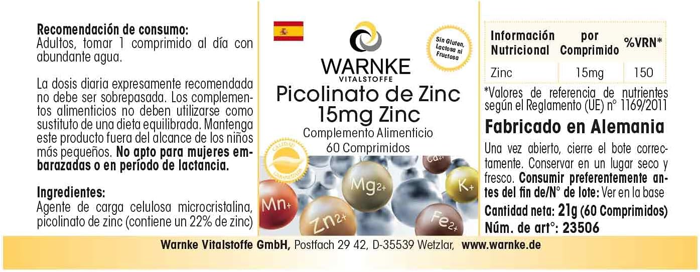 Le picolinate de zinc est une forme de zinc qui est souvent mieux absorbée par l’organisme. Warnke Vitalstoffe propose un dosage de 15 mg par comprimé, ce qui est idéal pour un apport quotidien. Ce produit est disponible en boîte de 60 comprimés, ce qui offre une cure de deux mois avec une posologie recommandée d’un comprimé par jour.
