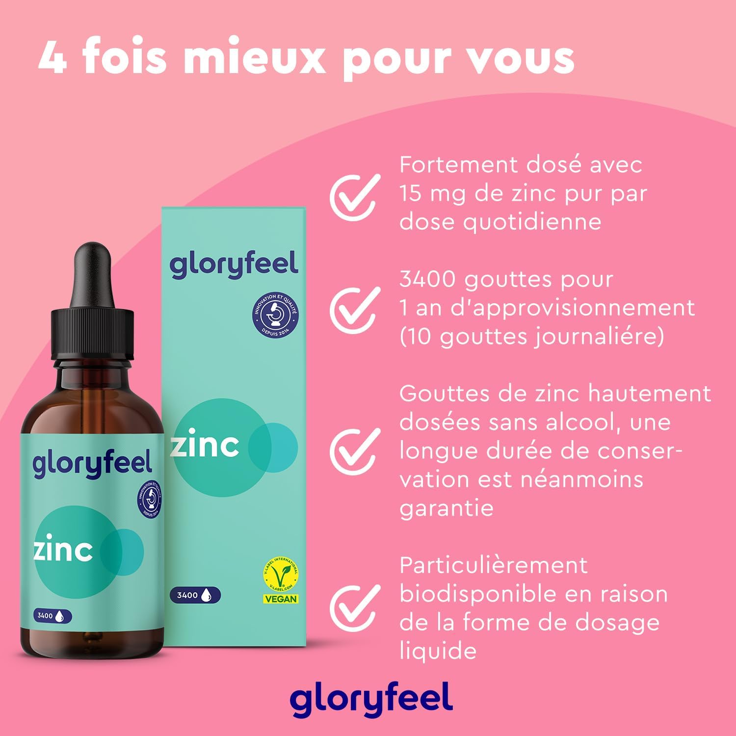 | Zinc Gouttes Gloryfeel | Liquide | 10 gouttes (15mg) | Haute | Aucun | 9,99 € |